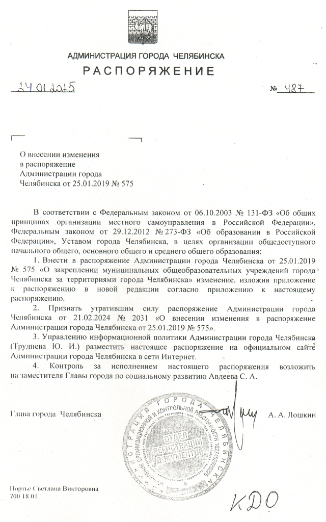 - Распоряжение Администрации города Челябинска № 487 от 24.01.2025 О внесении изменения в распоряжение Администрации города Челябинска от 25.01.2019 № 575 , с изменениями № 2244 от 26.02.2025